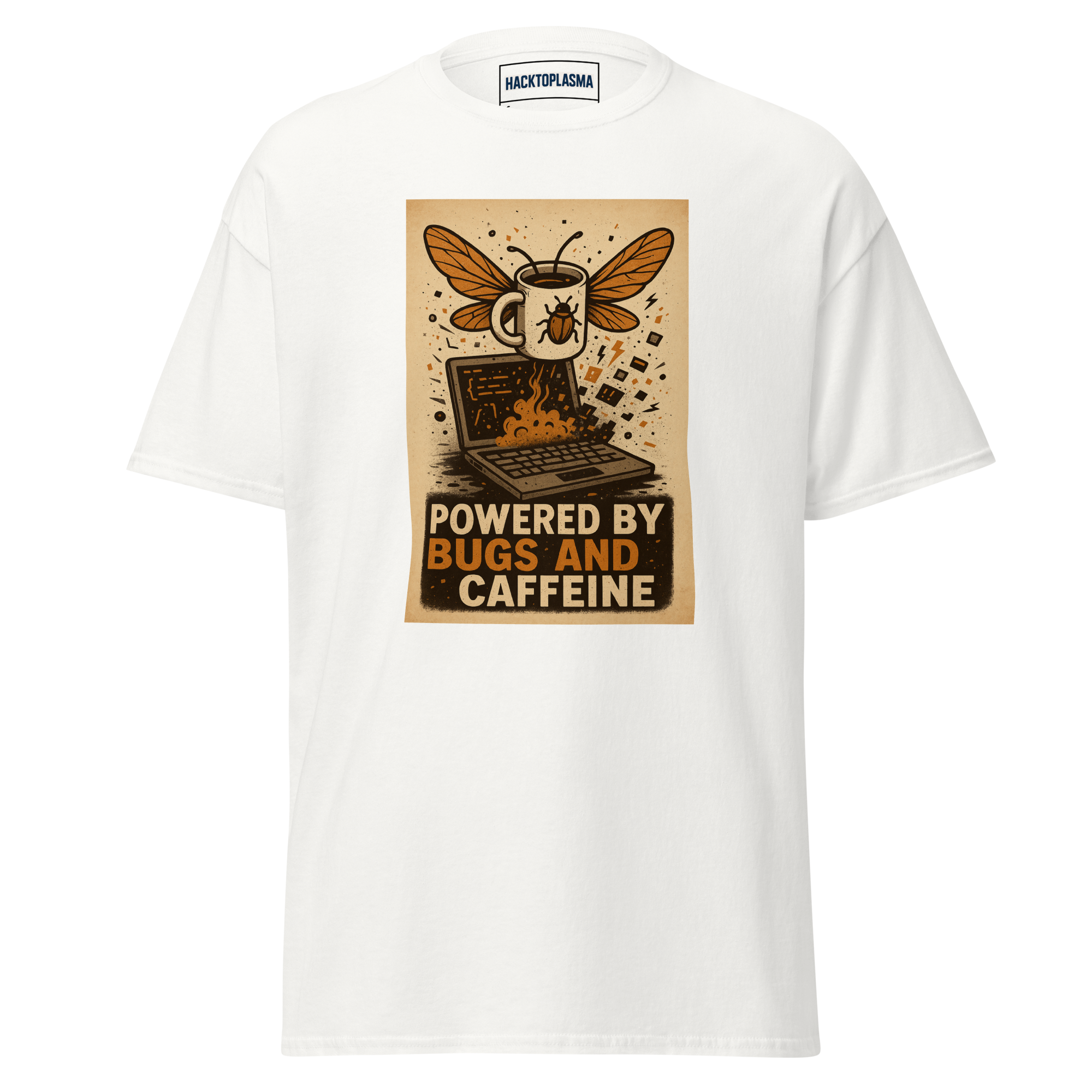 "Powered by bugs and caffeine" - 100% cotton nerd t-shirt